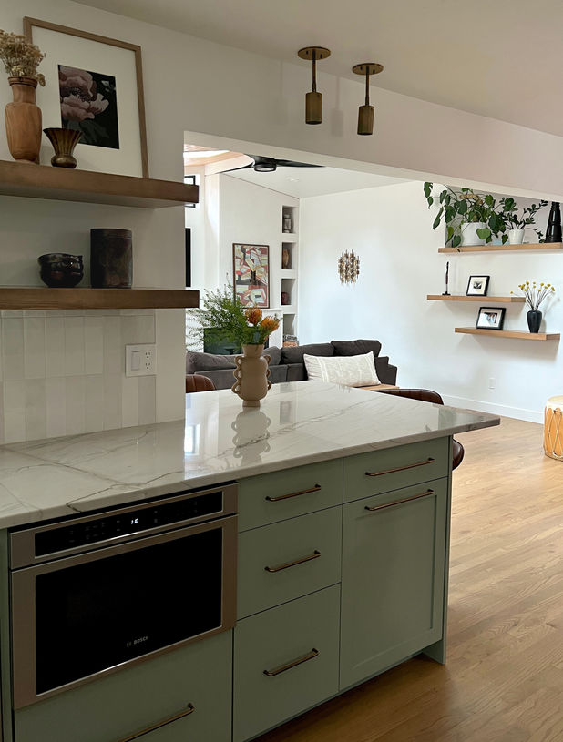 Transformed a 1967 mid century home into an inspired living space for a vibrant musical family. The original This kid and dog friendly space is now boasts a new warm and cozy fireplace crafted of custom fluted plaster, formed concrete connecting to a dropped ceiling. Altering the kitchen workflow and space plan in the created space for this food bloggers kitchen. PJHD worked closely with the client to develop the concept, palette and detailed interior design drawings to enable construction. Images courtesy of CLIENT & PJHD.